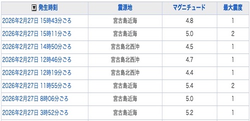 ニュース 宮古島近海で群発地震が発生中(2026年2月27日) 2026年2月27日 nofia 震度はともかく、マグニチュードがやや大きめですね。 2026年2月27日の宮古島での地震の発生状況 地震情報 宮古島の位置 Google Map