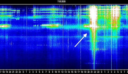 以下のように大きな範囲で白くなっているところが、7.83Hzのシューマン共振の基本周波数を示しているようで、そこが大きく乱れています。