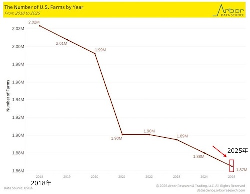 2025年のアメリカの農場数は前年比 -15,000減少し、187万にまで落ち込み、1850年代以来の最低を記録した。