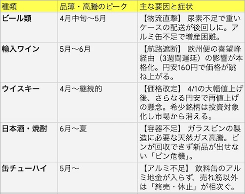 2026年4月3日現在のイラン情勢(物流停滞、円安160円、尿素不足、容器コスト高騰)を踏まえて、アルコールの種類別に「いつ頃、どのような形で品薄・高騰が起きるか」のAI予測