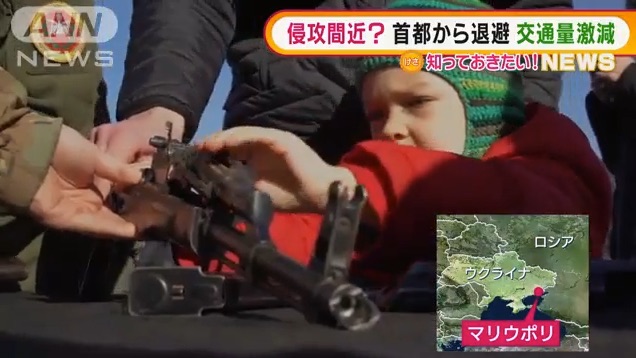 ロシアの国境から、わずか40キロのウクライナ東部の街、マリウポリ。子どもやお年寄りは、銃の扱い方を学んでいました。