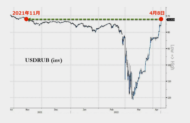 ニュース ロシアルーブルが、ウクライナ侵攻前を回復するどころか、2021年11月以来の高値に達する 2022年4月9日 nofia ドル / ルーブルの推移 Ruble Surges To 5-Month Highs After Russia Unexpectedly Slashes Rates By 300bps