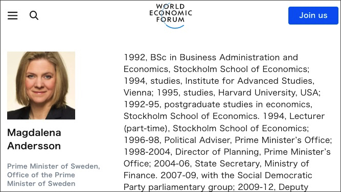 世界経済フォーラムよりスウェーデン首相マグダレナ・アンデションさんのページ