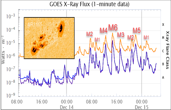 ニュース 太陽活動が久しぶりに活発。過去24時間でMフレアを8回発生させている 2022年12月15日 nofia 2022年12月14日-15日のフレアの発生状況 spaceweather.com この24時間、ほぼ連続で Mクラスのフレアが発生しており、黒点の数も 174とかなりの数に。