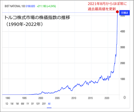 > 投資家たちが、消費者物価の高騰とリラの急落に対するヘッジとして株式を購入し続け、トルコの住民たちもまた、貯蓄を蓄えるための資産を求めているため、トルコ株式指数は 12月に 5000レベルを超えて取引される新記録を更新し続けている。 (tradingeconomics.com)